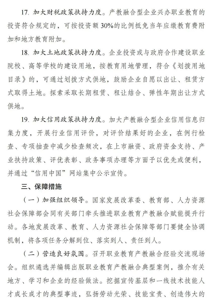 为贯彻落实党的二十大精神,统筹解决人才培养和产业发展“两张皮”的问题,推动产业需求更好融入人才培养全过程,持续优化人力资源供给结构,国家发展改革委会同有关部门研究制定了《职业教育产教融合赋能提升行动实施方案(2023—2025年)》。现印发给你们,请认真遵照执行。